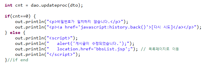 (4) updateproc 함수(BbsDAO.java에 작성할 예정)에 담고 비밀번호 일치여부 출력시키기