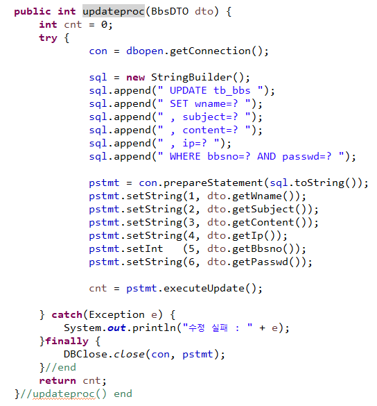 (1) int cnt = dao.updateproc(dto); sql문 가져오는 함수 작성하기