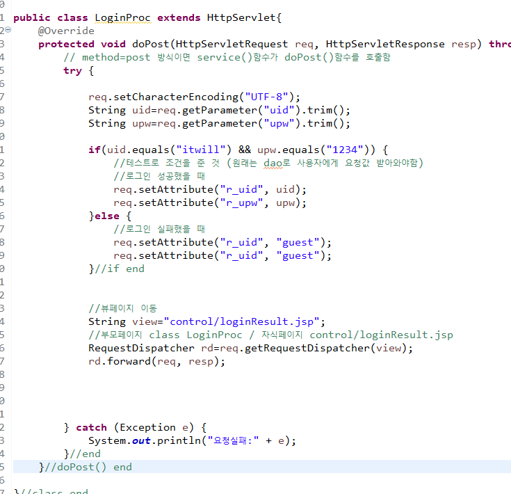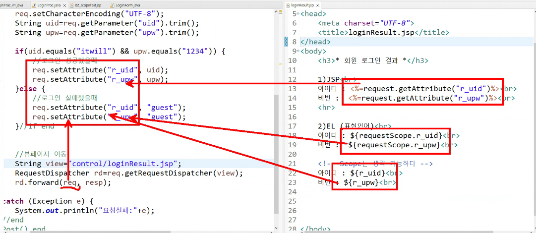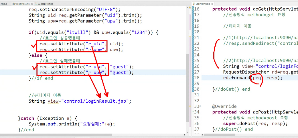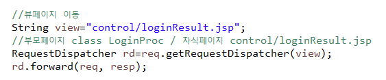 - 페이지 이동해주는 RequestDispatcher를 사용해서 자식페이지에서 값을 사용할 수 있도록 해준다.