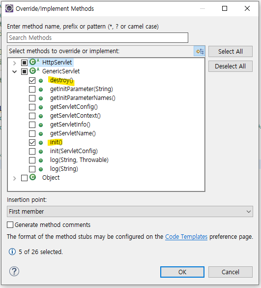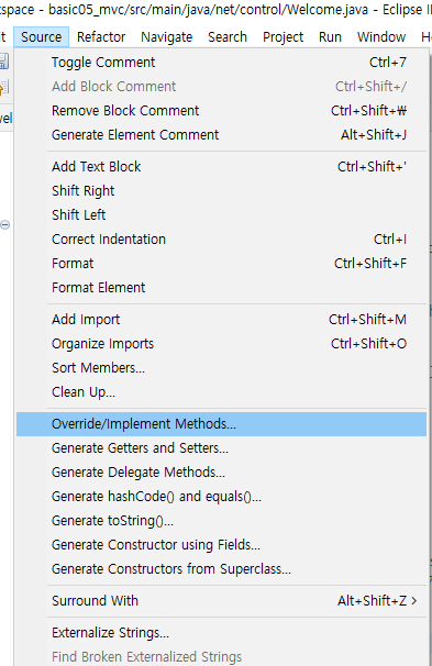 클래스 안에 커서 놓고 source로 override 자동등록하기