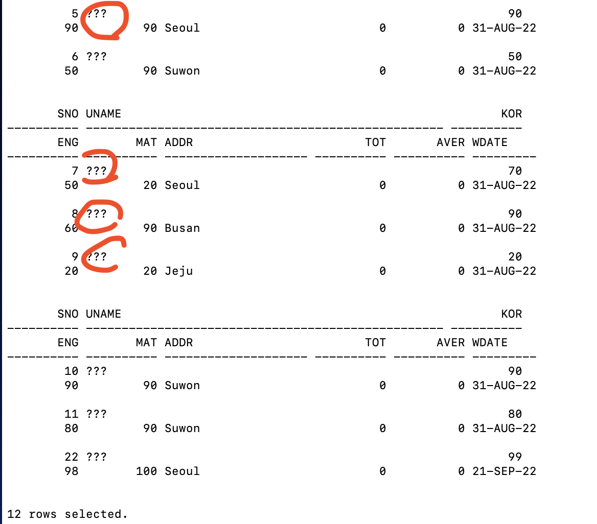 - uname 칼럼 이름 값이 모두 ? 물음표로 출력됨. 왜 이러는거야