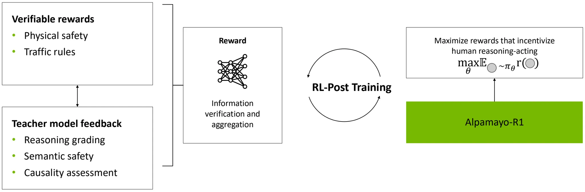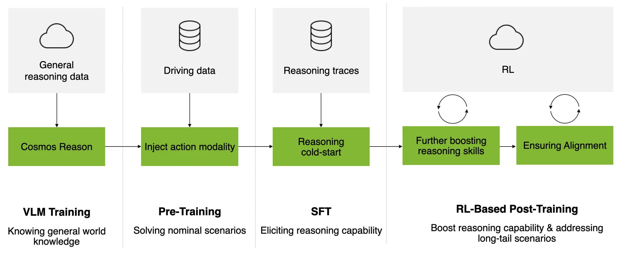 | Alpamayo-R1 모델 훈련 파이프라인 개요. (1) 행동 Modality 투입, (2) 추론 유도, (3) 강화학습 기반 사후 훈련의 주요 세 단계로 이루어져 있다. |