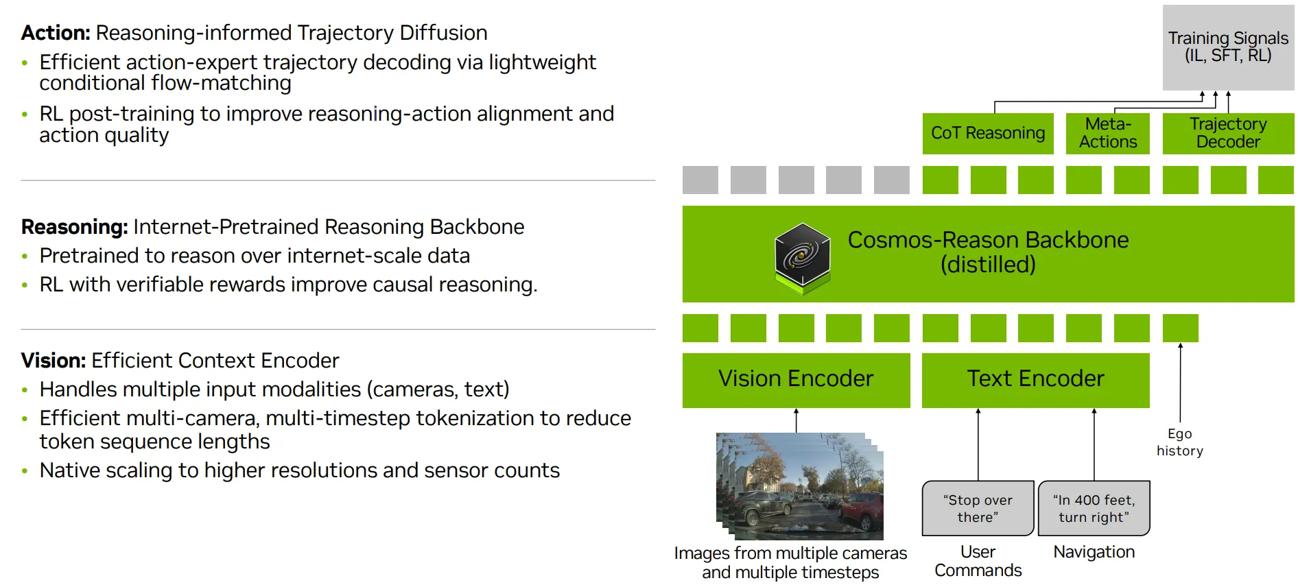 | Alpamayo-R1 아키텍처 개요. 다중 카메라 이미지와 에고-모션(자차 거동 데이터)는 시각적 토큰을 산출하는 비전 인코더에 의해 처리되고, 그것들은 텍스트 입력과 함께 VLM 백본에 입력된다. 모델은 자기회귀적으로 사고 사슬(chain-of-thought) 추론과 이산 경로 토큰을 생성한다. 추론 시, flow matching을 사용하는 행동 전문가 디코더는 추론 결과에 따라 이산 경로 토큰을 연속적이고 운동학적으로 실행 가능한 waypoint로 변환한다. |