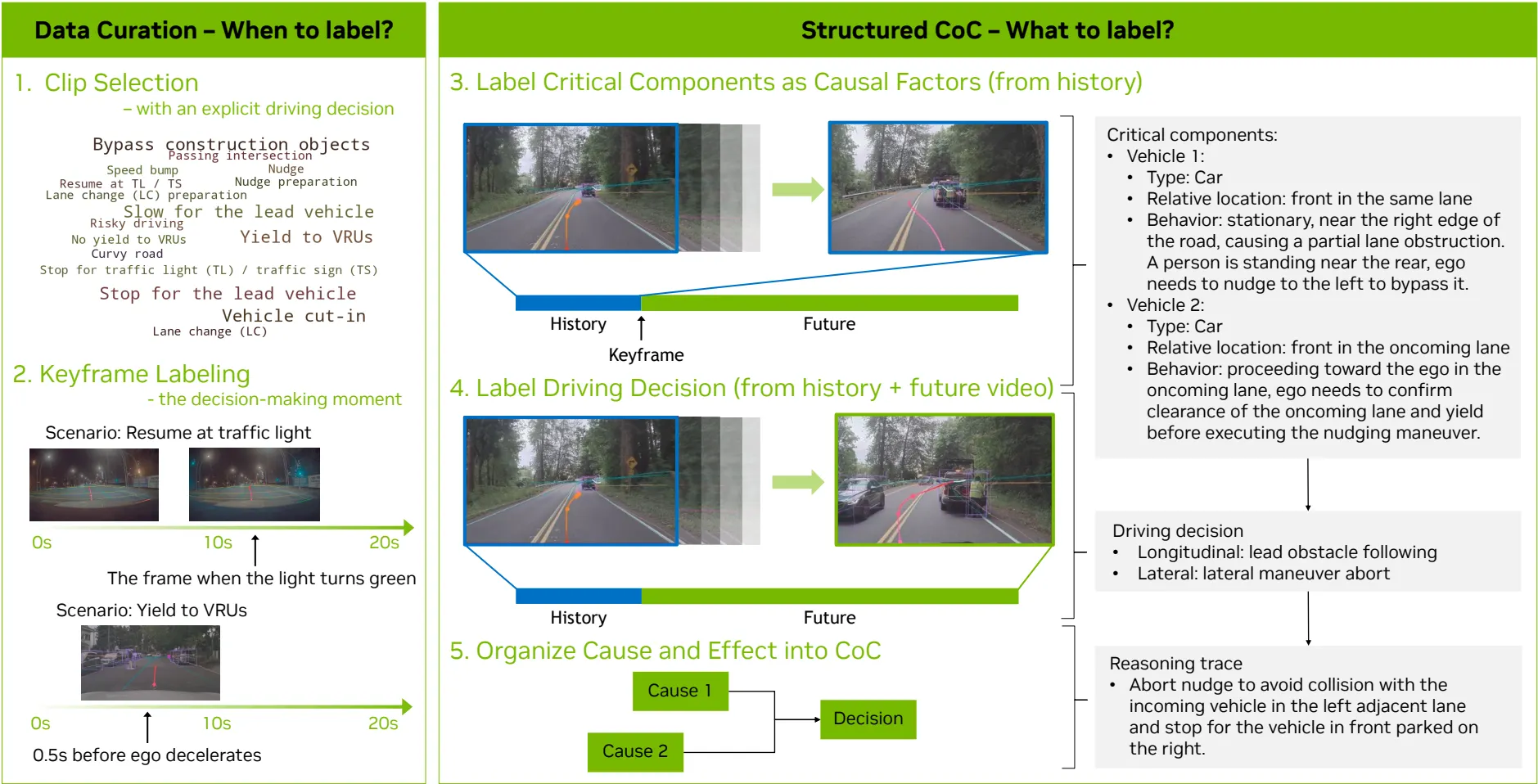 | 제안된 구조화된 CoC 레이블링 파이프라인. (1) 클립 선별, (2) 중요프레임 레이블링, (3-5) 구조화된 CoC 레이블링의 단계로 구성되어 있다. |