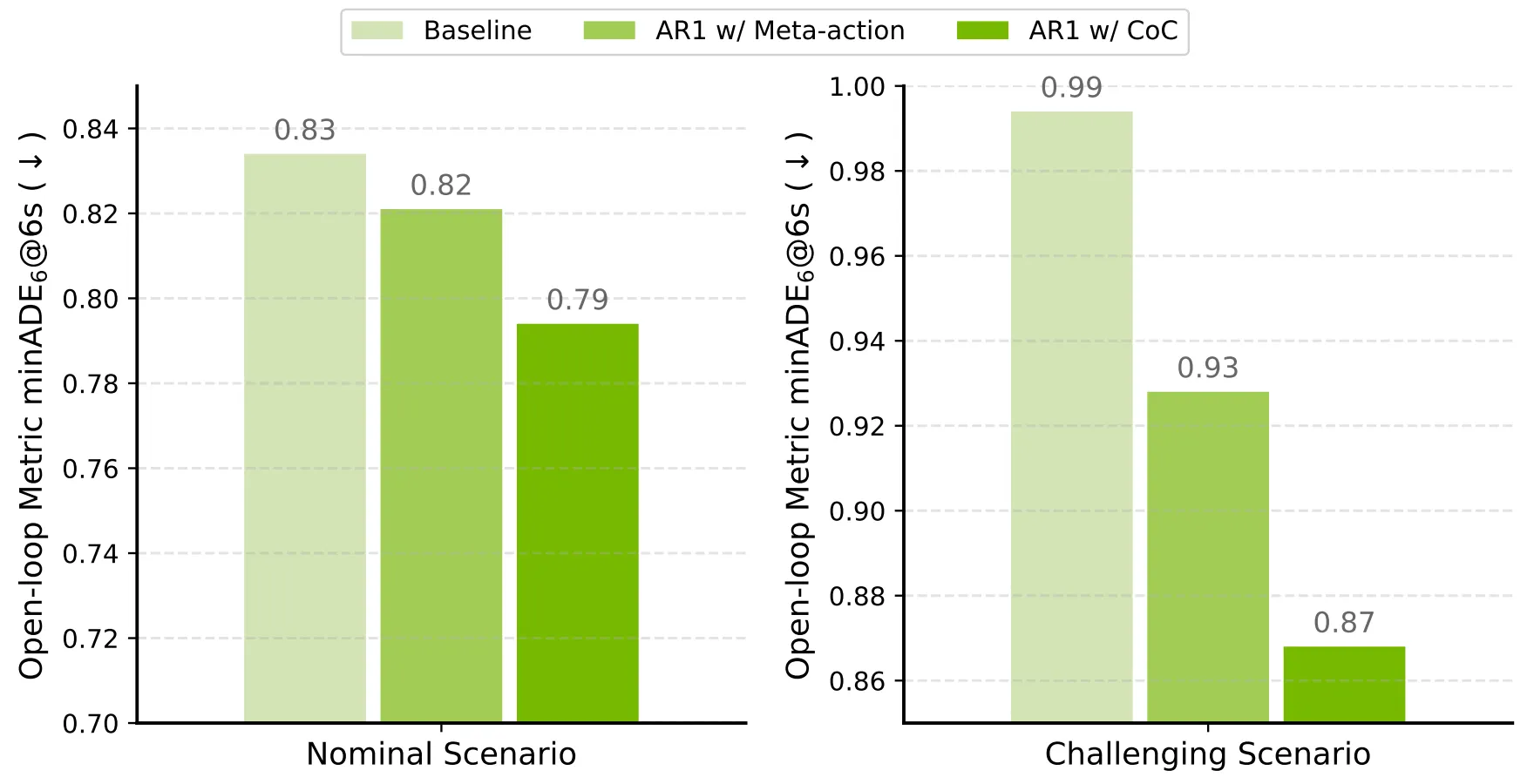 | 경로만 출력하거나 메타행동&경로만 출력하는 모델에 비해, Alpamayo-R1은 일반적인 시나리오와 도전적인 시나리오 모두 발전을 보였다. |