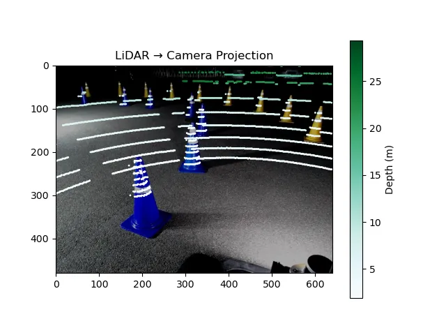 이처럼 3차원 라이다 포인트가 이미지 위의 실제 물체들과 잘 일치하는 것을 통해, 캘리브레이션이 올바르게 수행되었음을 시각적으로 확인할 수 있습니다. 특히, 콘에 투영된 점들이 형태를 따라 정확히 정렬되어 있는 것을 볼 수 있습니다.