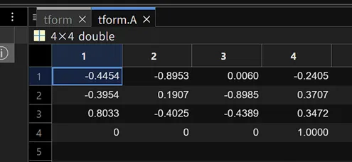 - 결과는 회전 행렬과 이동행렬을 동차 좌표계로 변환하여 형태의 형태로 표현됩니다.