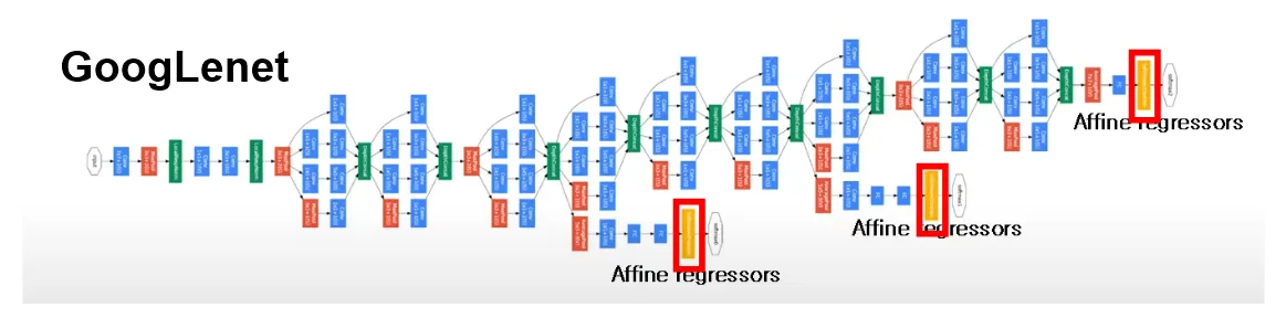 이때 실제로 저희가 활용하는 아웃풋은 가장 마지막에 있는 아웃풋이고, 중간중간 있는 affine regressors 레이어는 모델을 학습시키는 과정에서 backpropagation이라는 딥러닝 필수 과정이 들어가게 되는데 이때 중간중간에서 이를 보정해주게 됩니다.