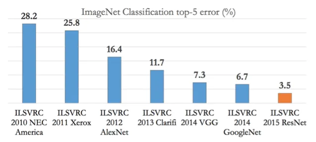 사람의 이미지 classification의 error가 8~9 정도 되는것으로 보아 2014년도부터 VGG가 사람의 이미지 분류 능력을 능가함으로써 딥러닝에 대한 관심도가 상당히 올라갔습니다.