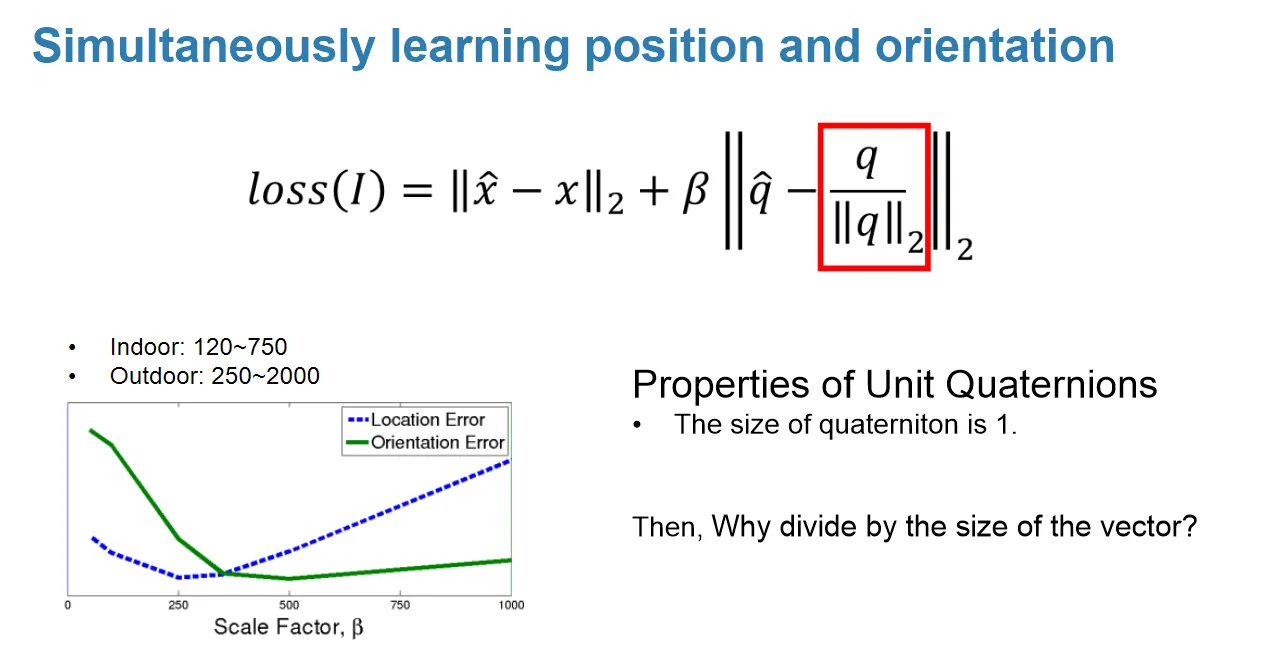 이때 postion의 유클리디언 거리와 orientation의 유클리디언 거리의 합으로 loss function을 정의하여 position과 orientation을 동시에 학습시키겠다는 전략을 취한것입니다.