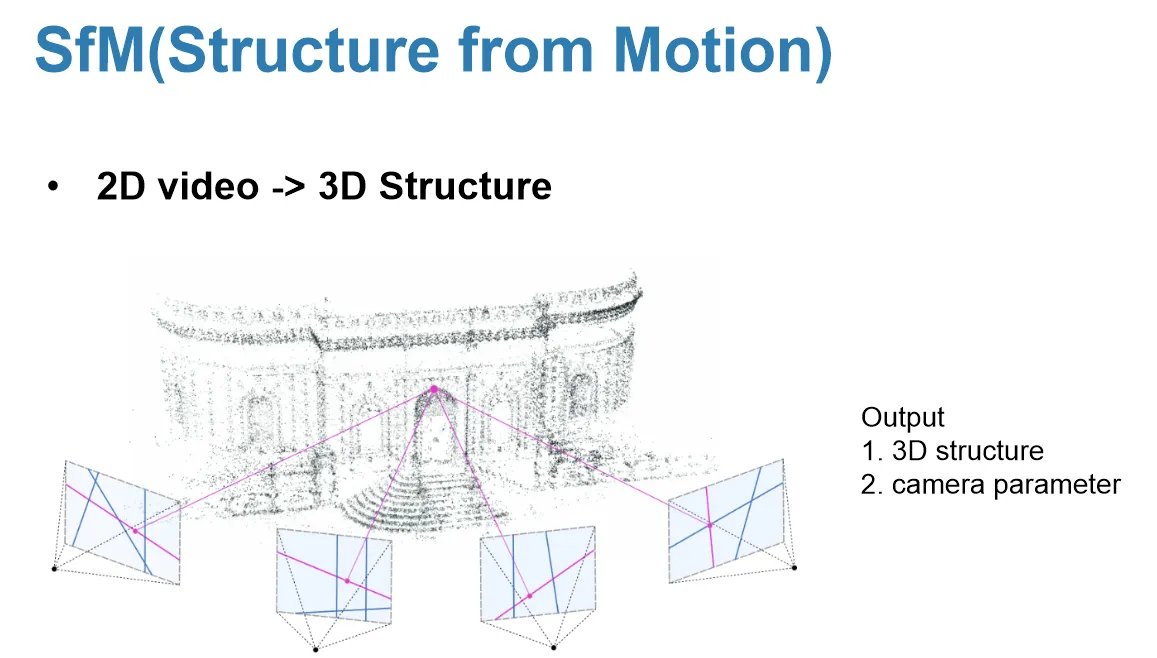 SfM의 이름에 맞게 2D video를 활용해 일정 frame단위로 이미지를 만들고 이를 에피폴라 기하학에 의거하여 3차원 구조물과 camera parameter를 생성하겠다는 의미입니다.