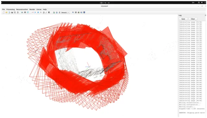 위 사진은 제가 실제로 local 환경(개인 pc)에서 SfM을 진행한 화면을 발췌한것인데요, 100여장 정도의 사진밖에 없었지만 output을 내뱉기까지 10여분 이상 소요됨을 확인하였습니다.