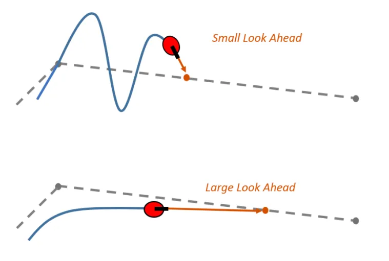 이때 Look Ahead Distance를 짧게 설정하면 경로를 추종하는 시간을 줄일 수 있지만 아래 그림에서 볼 수 있듯 진동하며 경로를 벗어날 수 있습니다.