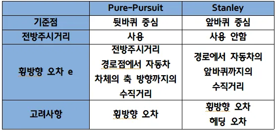 마지막으로 지금까지 살펴본 Pure Pursuit과 Stanley 알고리즘의 차이점을 간단하게 살펴보면 다음과 같습니다.