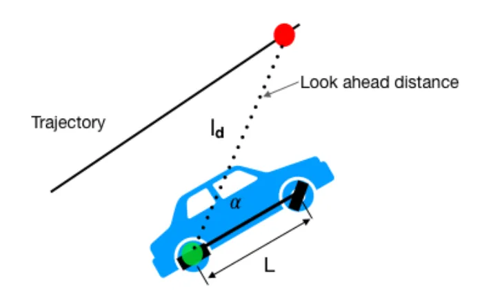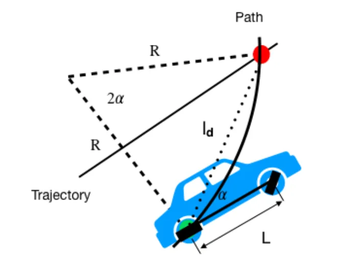 Pure Pursuit 알고리즘은 경로 추종 알고리즘 중 하나로, 차량의 후륜축의 중심을 기준점으로 사용하여 차량의 운동 방정식과 경로의 지오메트리만을 사용하는 간단한 알고리즘입니다.