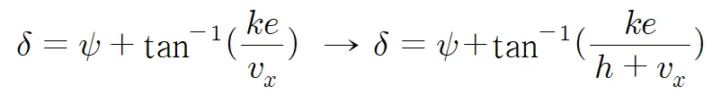 위 조향각 식에서 속도가 0에 가까울 때 tan역함수 값이 매우 커질 수 있기 때문에 이것을 해결하기 위해 아래와 같이 속도 상수 h를 추가해줍니다.
