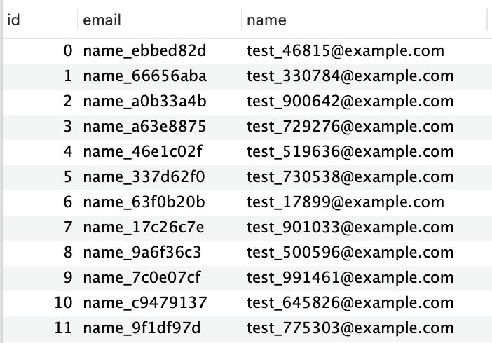 테이블은 PK인 id, name, email로 컬럼이 구성되어 있다.