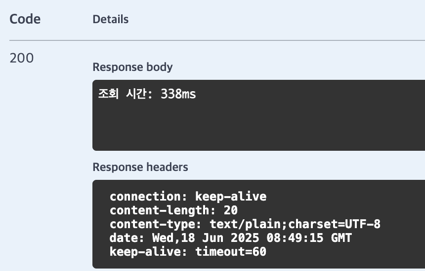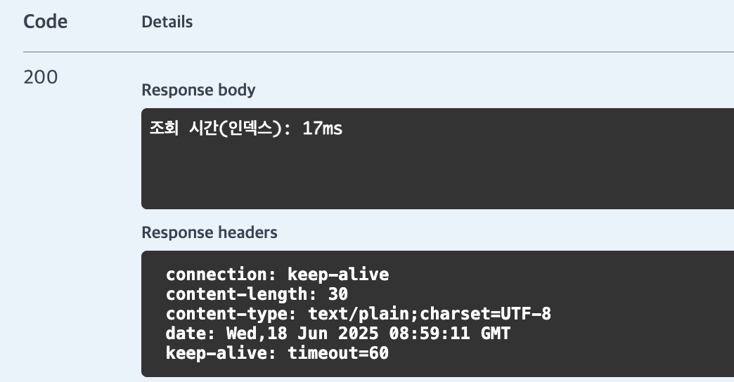 return ResponseEntity.ok().body("조회 시간: " + (end - start) + "ms");