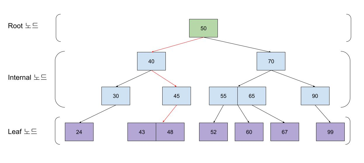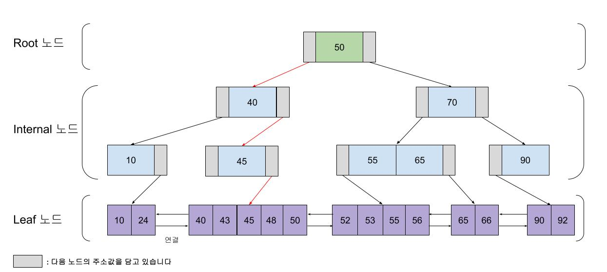 그림을 보면, B+Tree는 Leaf 노드가 서로 연결되어 있다.