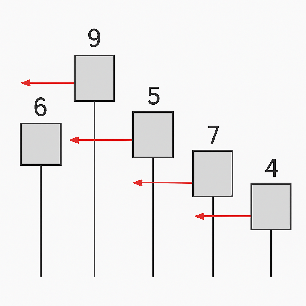 | 감소 스택 (Decreasing) | Stack이 내림차순을 유지, 새로운 값이 peek() 보다 작을 때까지 pop() |