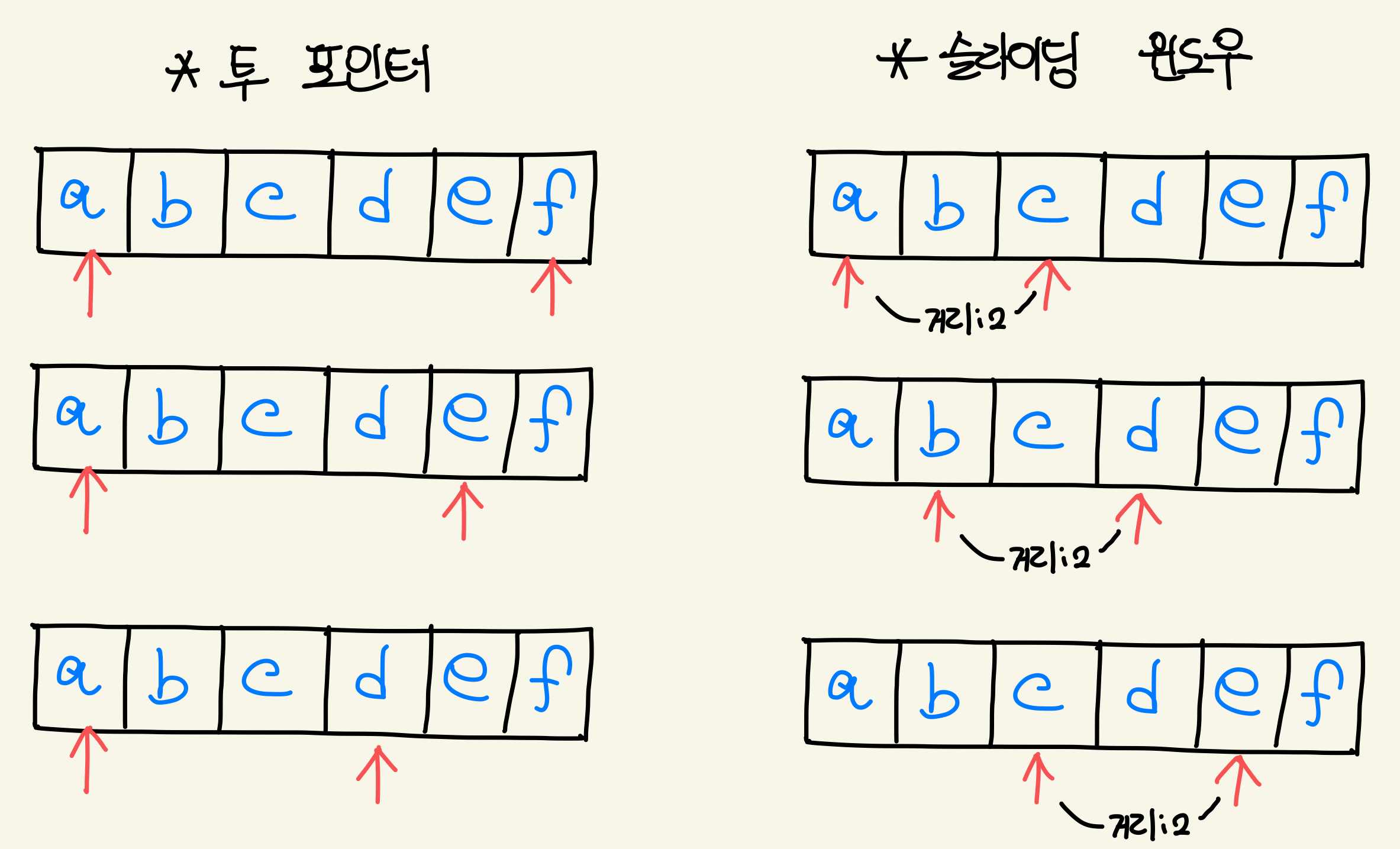 슬라이딩 윈도우는 항상 구간의 넓이가 고정 (즉, 포인터는 하나면 충분)