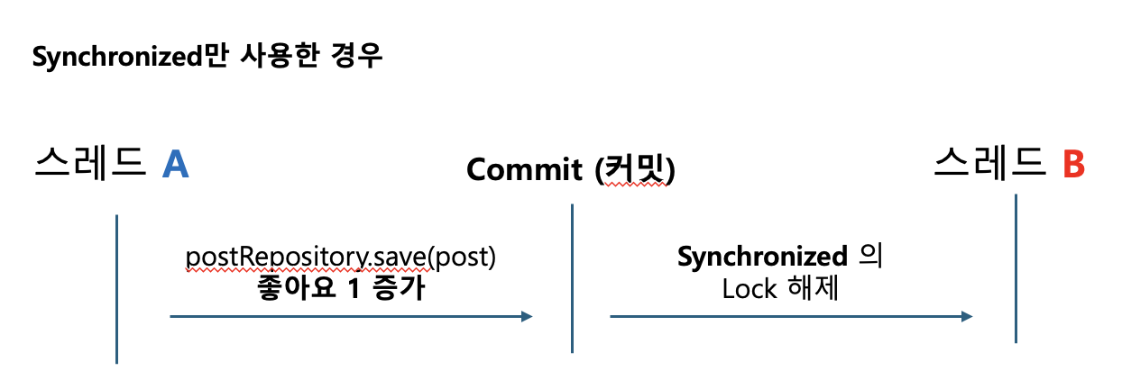 즉, 커밋 시점이 synchronized의 락이 풀리는 시점보다 빨라서 "경쟁 상태"가 발생하지 않는다.