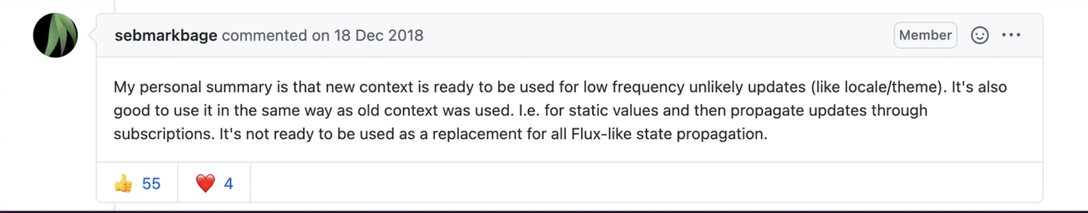 위 트윗은 리엑트 개발 팀원이 공식적으로 언급한 내용인데, 컨텍스트API를 도입된 당시에 저빈도 업데이트(테마변경, 인증 등등)같은 업데이트는 훌륭하지만, 데이터가 자주 변경되는 경우에는 좋지 않다고 언급한걸 볼 수 있다.
