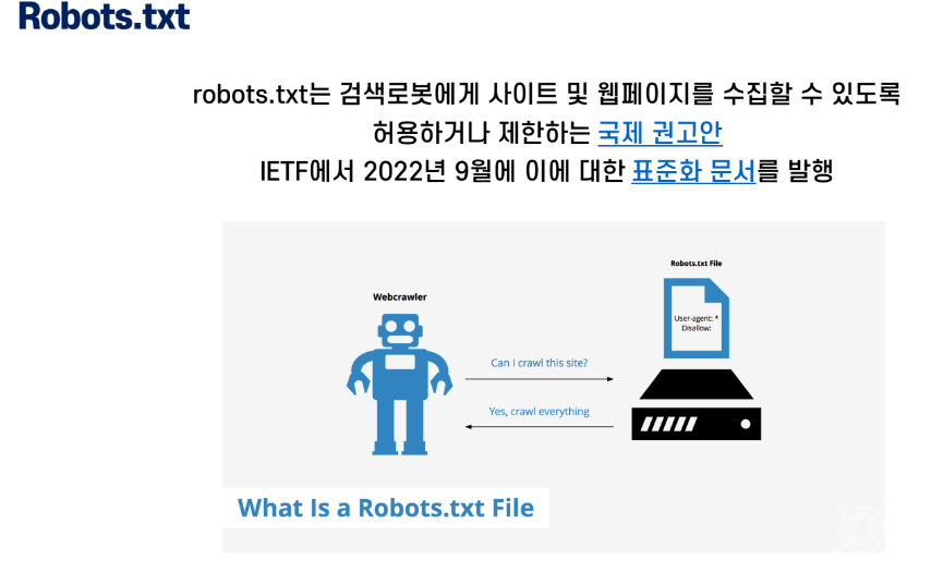 • 이에 따라 로봇 제외 표준(Robots Exclusion Standard)이라고 불리는 robots.txt 파일의 문법이 만들어짐