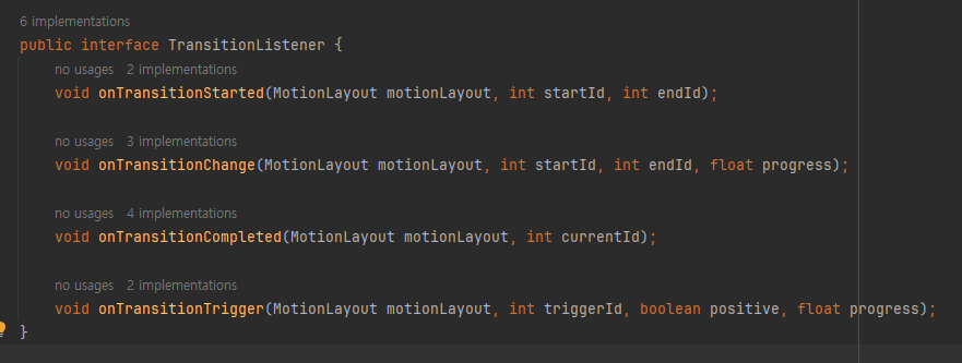 이런식으로 모션레이아웃에 TransitionListener를 지정할수있습니다.