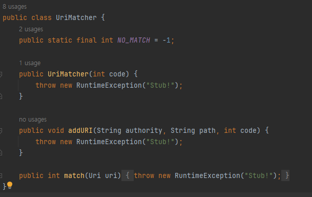 내부는 이런식으로 생성자, Uri조건을 추가하는 메서드, Uri를 집어넣어 해당Uri와 매칭되는것있는지 확인하는 메서드들로 구현되있습니다.