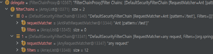 SecurityFilterChain 0번째에는 "/test" URI 패턴을 가진 filters size가 0인 FilterChain이 들어가고