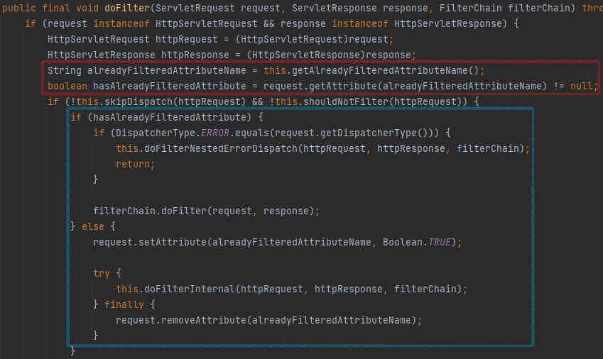 OnecePerRequestFIlter의 doFilter() 메소드를 보자면 request 속성 값에서 해당 필터의 이름이 존재한다면 이미 한번 실행한 것이므로 다음 필터로 넘어가고 존재하지 않는다면 request 속성 값에 필터의 이름에 대하여 true로 값을 넣고 필터의 작업을 수행하는 것을 확인할 수 있다.