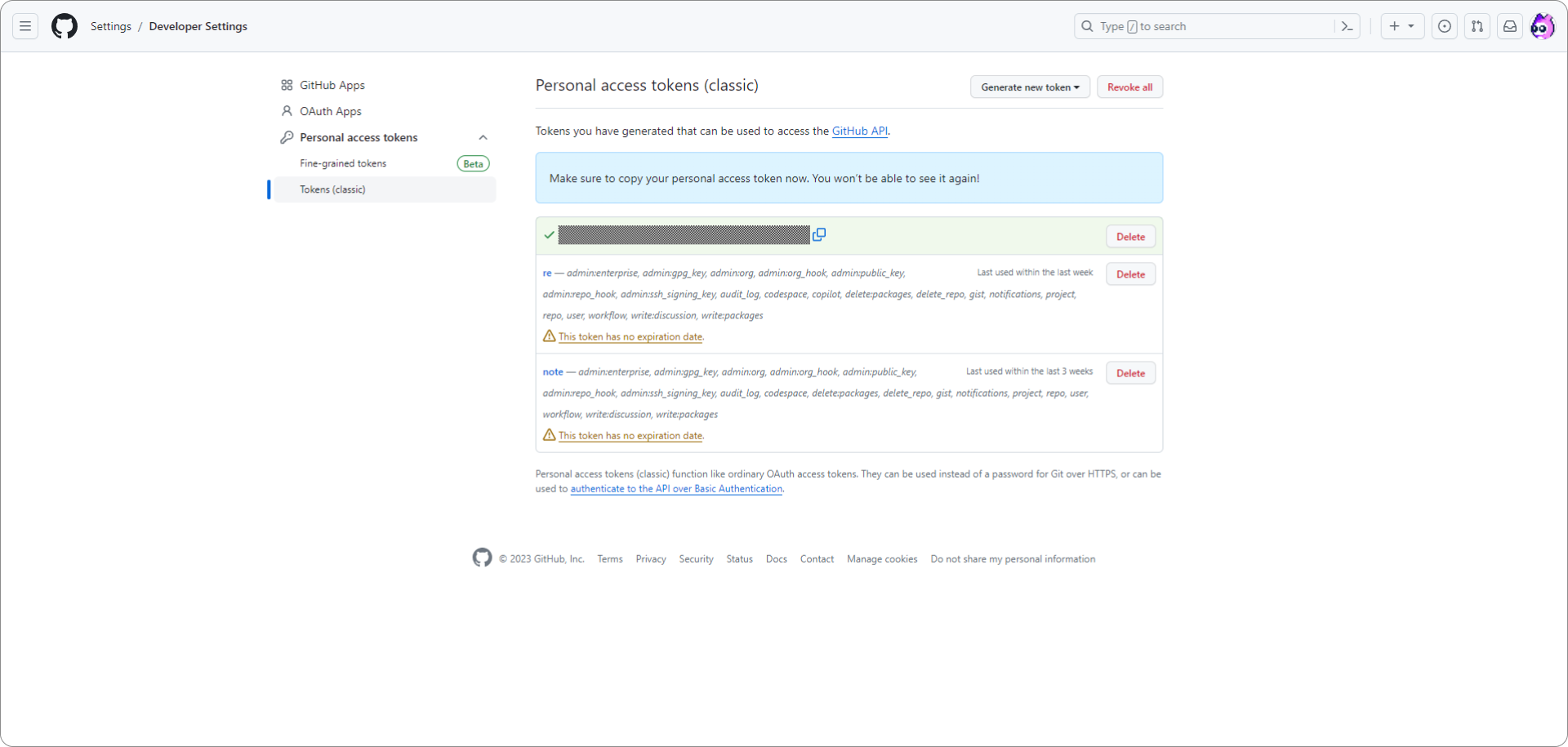 ※ 토큰은 해당 페이지를 벗어나면 다시 확인할 수 없어 새 토큰을 재발급 받아야만 한다.