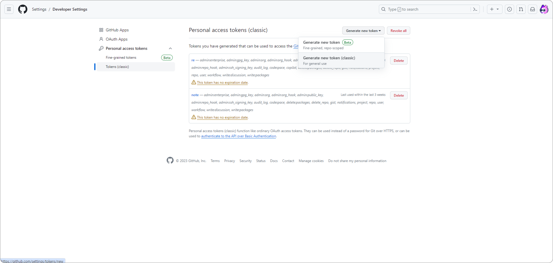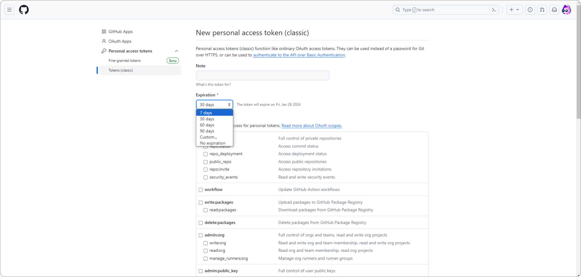 4. Note에 토큰에 대한 설명을 간단히 기입 후 토큰 유효기간을 설정한다.