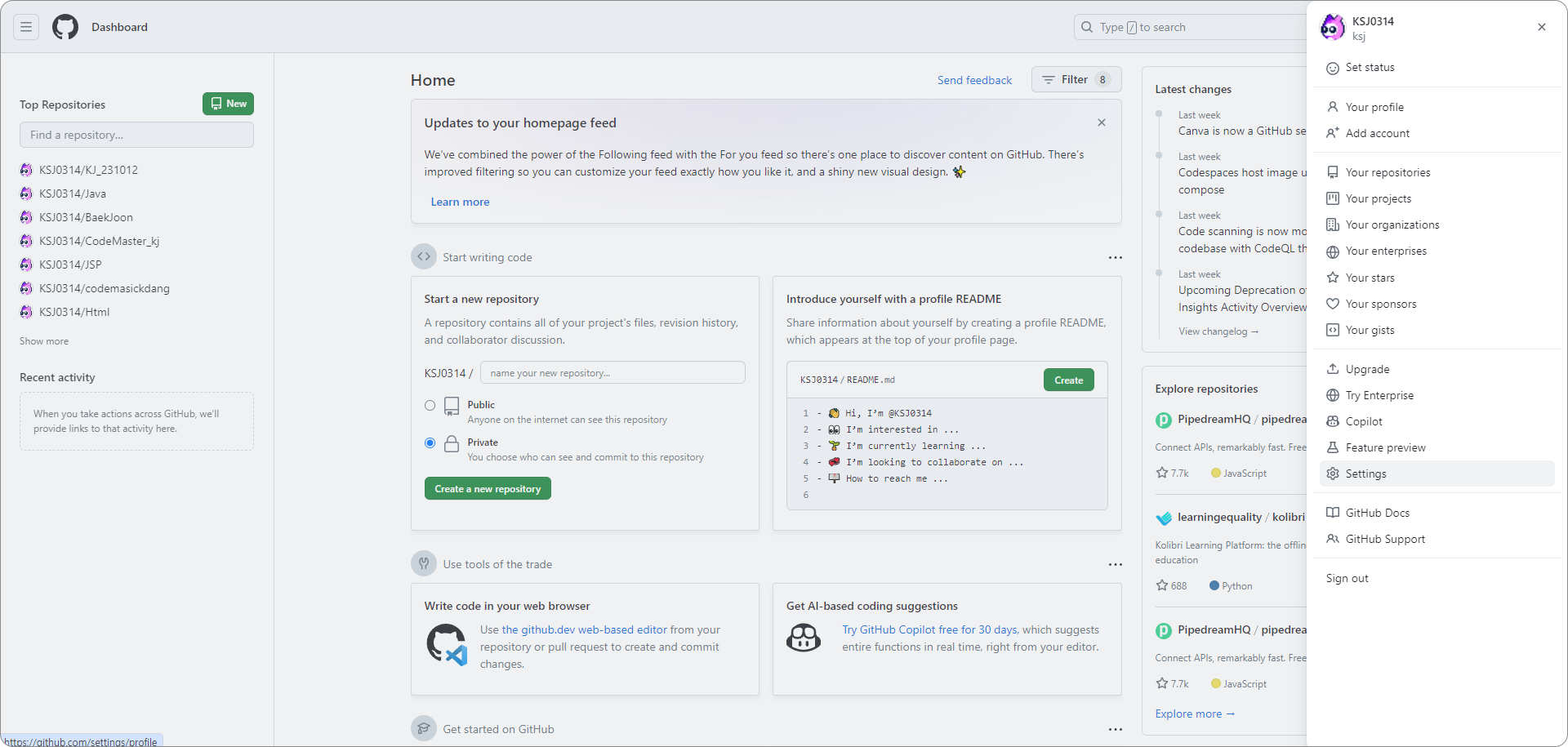 1. GitHub에서 프로필 사진을 눌러 Settings