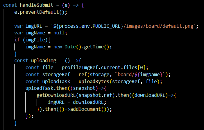 imgURL은 Firestore에 저장할 때(addDoc)도 사용하기 위해 상단에 빼두었고 사용자가 이미지를 업로드하지 않았을 때에 기본 이미지를 출력하기 위해 `${process.env.PUBLIC_URL}/images/board/default.png