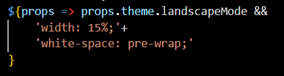 import styled, { css } from "styled-components"; ~~~ const Title = styled.div` ${props => props.theme.landscapeMode && css` width: 15%; white-space: pre-wrap; `} `