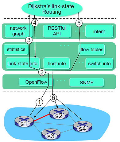 2 ) SDN controller가 OpenFlow message 수신, link-status 정보 업데이트