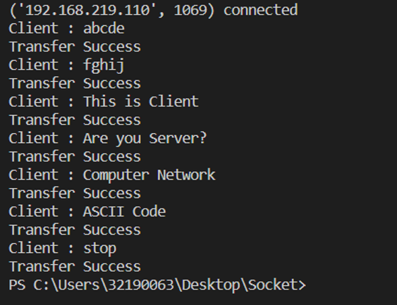 Client에게 stop 입력을 받으면 while문을 탈출하여 socket을 close하고 연결을 종료합니다.