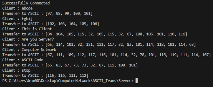이후 Client에서 입력한 문자열들을 Server에서 ASCII 코드로 변환하여