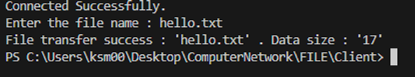 Client 측에서 연결 완료 후, hello.txt 파일을 요청하기 위해 입력합니다.