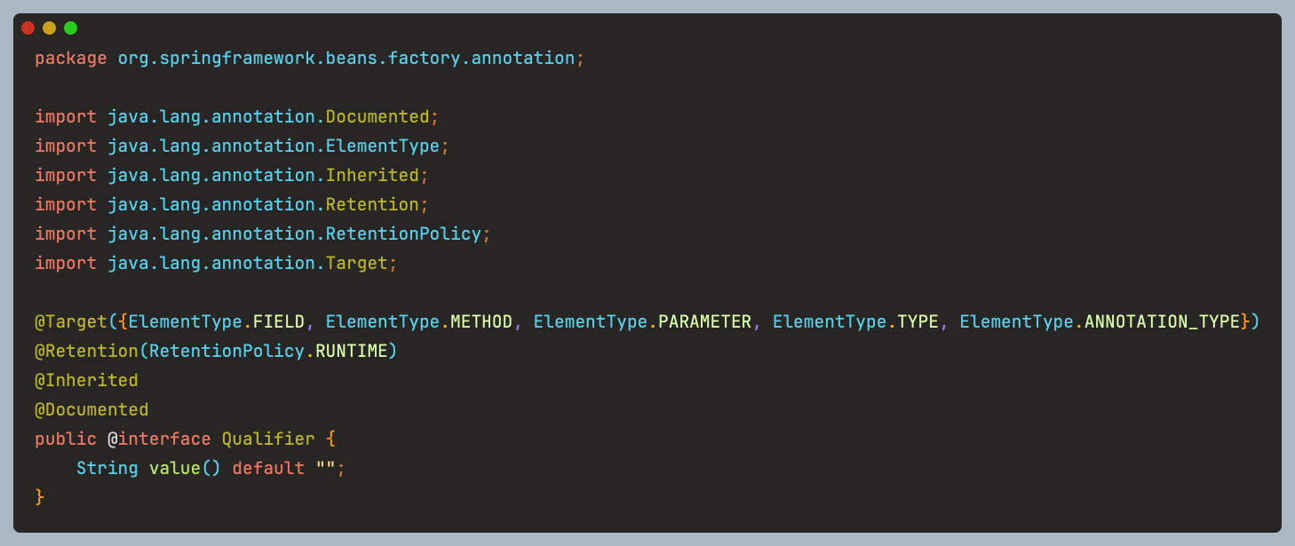 @Qualifier의 코드를 타고 들어가 붙어있는 어노테이션들을 훔쳐오기로 했다.