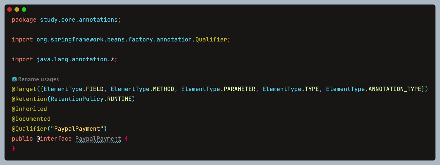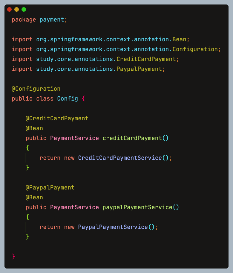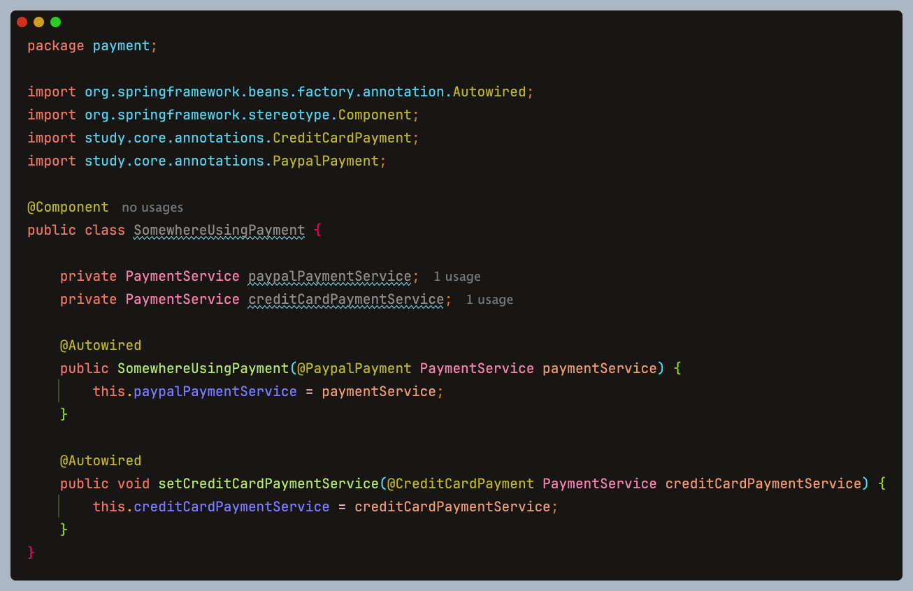 애플리케이션에서 결제 수단을 관리하는PaymentService가 있고, 결제 수단에는CreditCardPayment와PayPalPayment두 가지 구현체가 있다. 각 컨텍스트에서 사용할 결제 서비스를 명시적으로 구분해 주입해야 한다는 상황을 가정하면 다음과 같은 상황이 펼쳐진다.