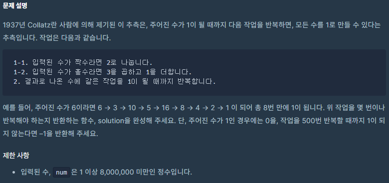class Solution { public int solution(int num) { int cnt=0; return collatz(num,cnt); } public int collatz(int num, int cnt) { if(cnt>=500) return -1; if(num==1) { return cnt; } else if(num%2==1) { return collatz(num*3+1,++cnt); } else { return collatz(num/2,++cnt); } } }이 짧은 코드 자체를 적는 것은 어렵지 않지만 재귀함수는 보다 깊은 사고를 요해서 시간이 알고리즘을 짜는 데 필요한 사고력과 머리속으로 코드의 흐름을 읽는 능력을 향상시키는 데 도움이 되는 것 같다.