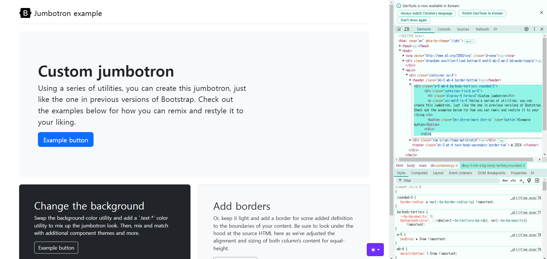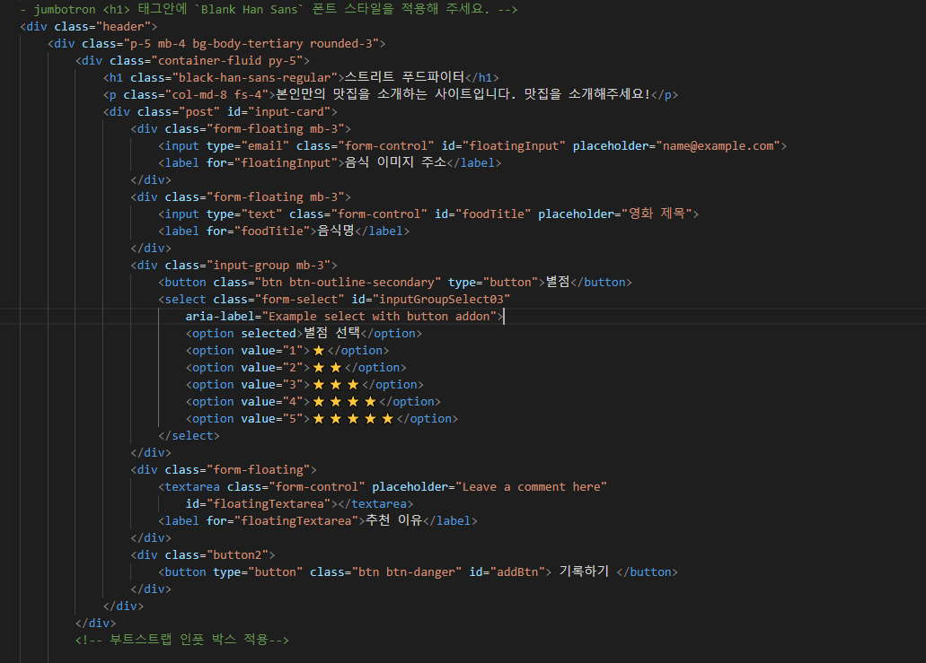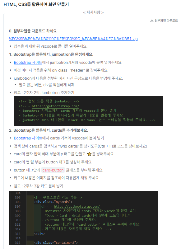 일단 숙제의 내용을 따라 jumbotron을 가져와 적절하게 배치해줬다.