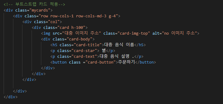 그리고 마무리단계로 버튼, 태그추가, 폰트적용 등을 한 뒤 카드에 적당한 이미지와 글을 적어준다.