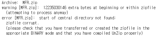 구글링 결과 윈도우환경에서 압축한 파일을 리눅스에서 해제하려고 하면 발생하는 문제였다.