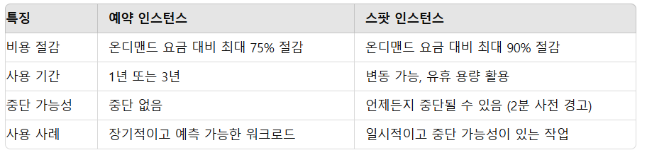 예약 인스턴스와 스팟 인스턴스를 통해 비용을 절감할 수 있는 옵션을 제공한다.