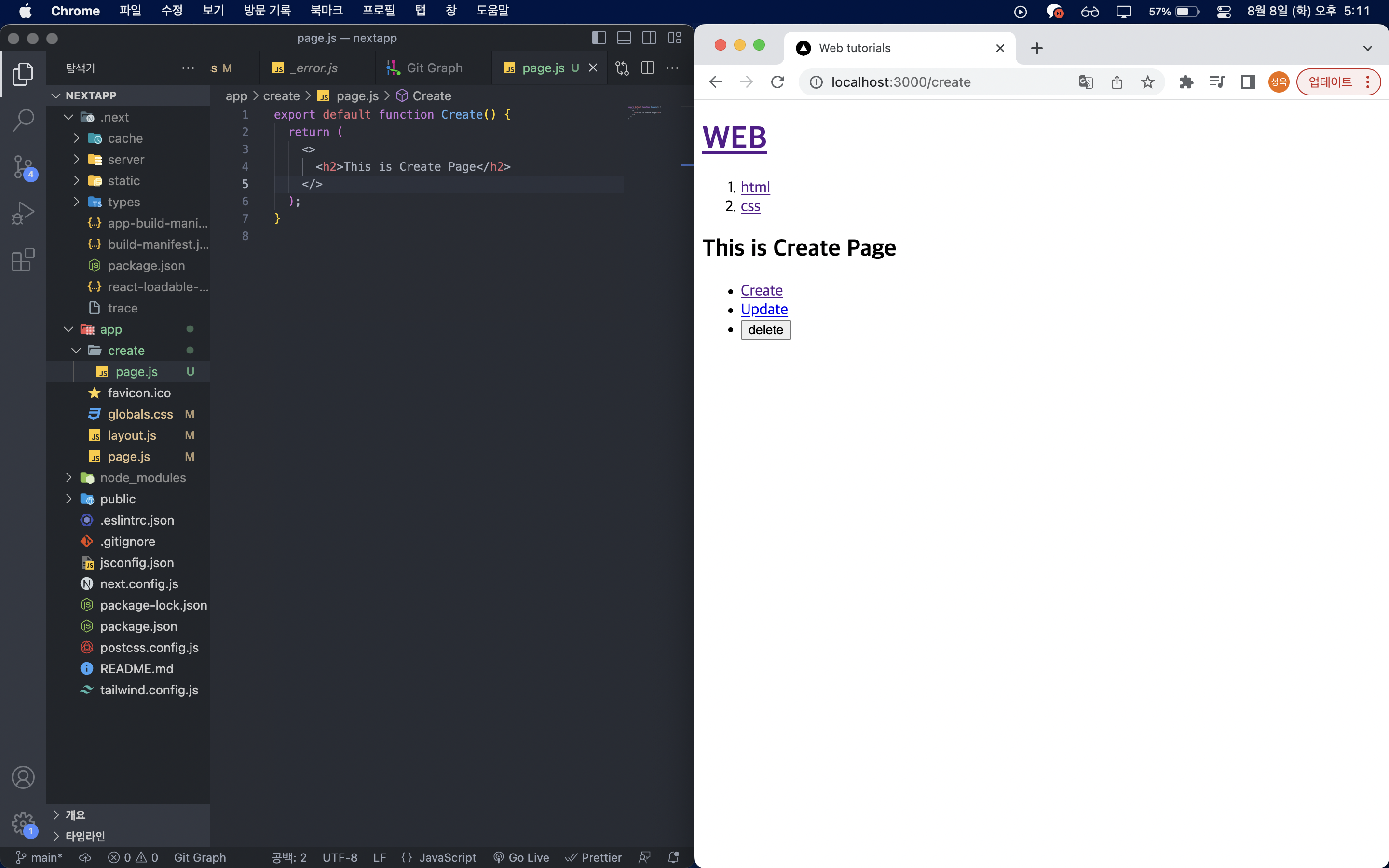 만약 app/layout.js를 이용하여, app/create/page.js를 감싸는 하위 레이아웃을 만들고 싶다면, create 폴더 내에 새로운 layout.js 파일을 만들면 된다.