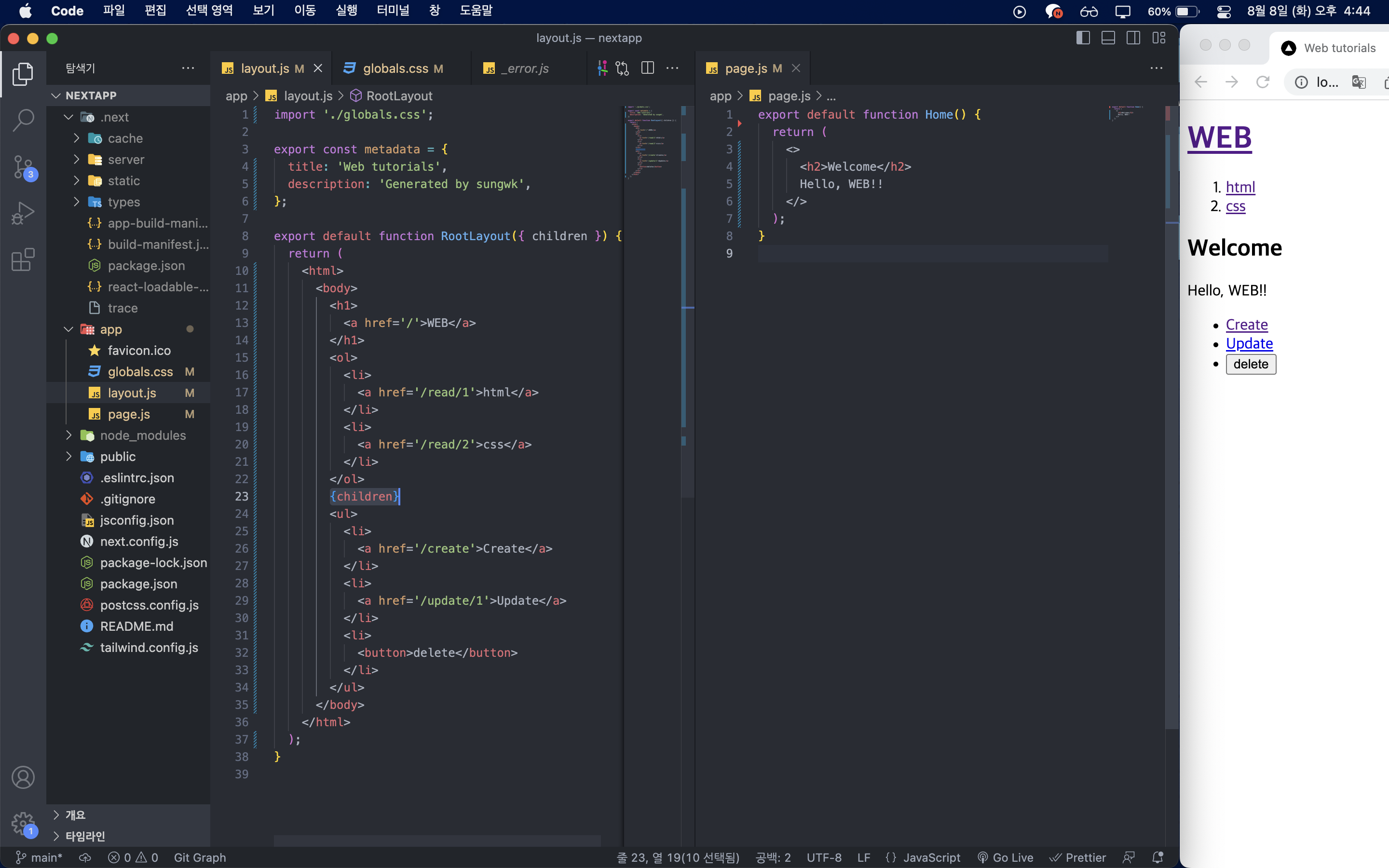 우선 처음에 프로젝트를 만들었을 때 app폴더 안에 layout.js와 page.js가 있는것을 확인할 수 있다. 저기있는 layout.js 파일이 웹페이지의 기본적인 골격을 가리킨다. 그리고 그 layout안에 있는 {children} 코드 위치에 page.js에 작성한 컨텐츠가 위치하게 된다. 따라서 위처럼 코딩하면 오른쪽에 있는 옹졸한 페이지가 완성된다.